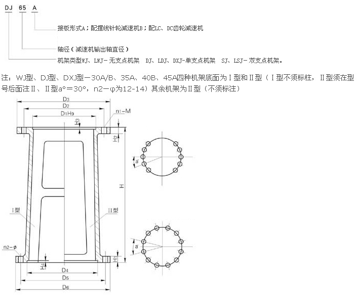 本系列機架可與各種立式擺線針輪減速機相配,可配套選用各種聯(lián)軸器,若與齒輪減速機配套,連接尺寸由本公司自選調(diào)整,為安裝雙端面機械密封,配備LWJ、LDJ、LSJ等增高型,除LWJ的H值和LDJ、LSJ的H及H2值增大以外,其余尺寸均未變動。