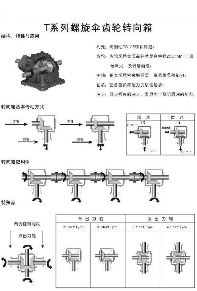 T系列螺旋傘齒輪轉向器采用全系列模塊化式組合設計制造,低噪音、高轉矩、無漏油,單伸出軸、雙伸出軸產品。