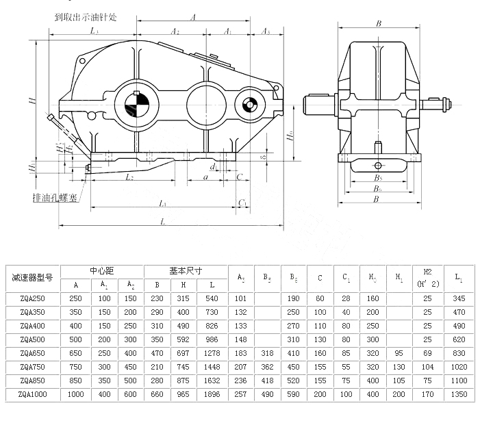 ZQA型減速器是在ZQ型減速器的基礎上改型設計的。為了提高齒輪的承載能力,又便于替代ZQ型,即安裝尺寸和外形尺寸、輸入和輸出軸伸不變的情況下,只改變齒輪的材質和熱處理方式采用中硬齒面。并將ZQ型減速器的一級速比23.34改成25.02。