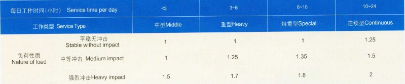 b.減速器入軸功率為電機功率的1.4—2.5倍,即按單級選用方法計算后,K1.K2之乘積小于2.5者,可以電機全容量選用。以“△”表示,多用于中等沖擊或嚴重沖擊的工作負荷。