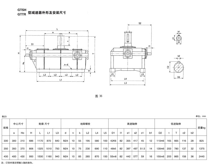 GTTR三環(huán)減速機(jī)為組合二級傳動,為鋼包回轉(zhuǎn)臺用,具有兩根垂直于平面的高速軸,箱體平置,裝端面剖分,此減速機(jī)中心距范圍300-400mm,速比77.9-503.3,輸出轉(zhuǎn)矩范圍10.52-24.67kN.m。